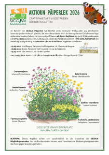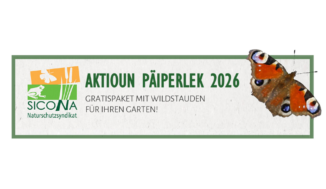 Im Rahmen der Aktioun Päiperlek hat SICONA sechs heimische Wildstauden aus zertifizierter luxemburgischer Herkunft gewählt, die einen besonderen Wert als Nektarpflanzen für Schmetterlinge und andere Insekten haben. Sie können diese Pflanzen ab dem 1. April 2026 als gratis Wildstaudenpaket auf www.sicona.lu reservieren. Achtung: die Anzahl der Pakete ist begrenzt - first come, first served! Die Verteilung erfolgt Anfang Mai von 16:00 Uhr bis 18:00 Uhr an folgenden Standorten: