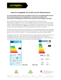 Ab Juli 2025 werden Wäschetrockner ausschließlich mit dem neuen EU-Energielabel gekennzeichnet. Die Plus-Klassen gehören dann der Vergangenheit an. So wird der Stromverbrauch für Verbraucher:innen künftig leichter einzuordnen sein! Hier finden Sie die wichtigsten Änderungen.