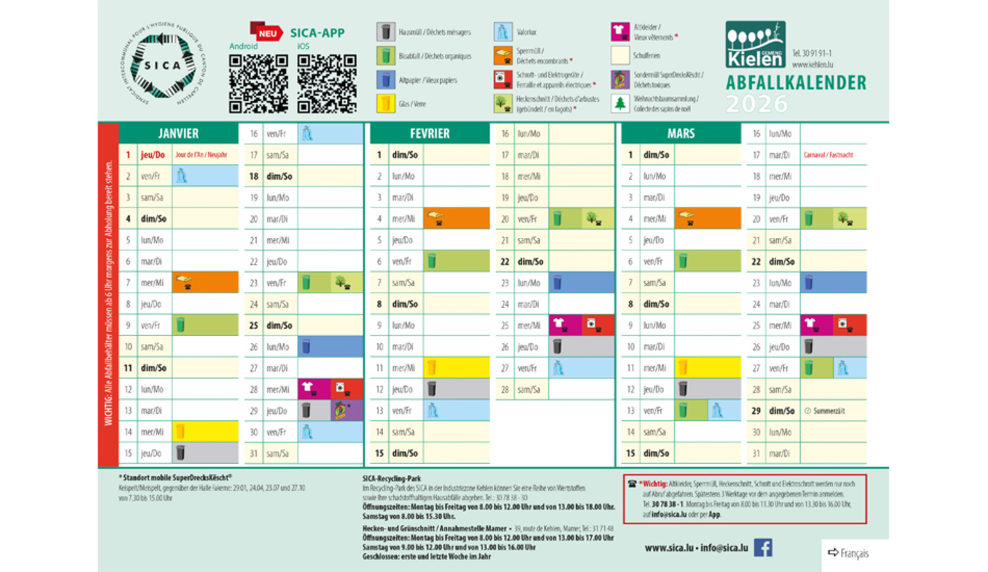 An Zesummenaarbecht mam SIDOR gëtt de SICA-Ëmweltkalenner fir all Gemeng erstallt. Hien informéiert iwwert Datume vum Ofhuele vum Offall vum ganze Joer, a gëtt am Dezember un all Haushalt vun de SICA-Gemenge verdeelt.