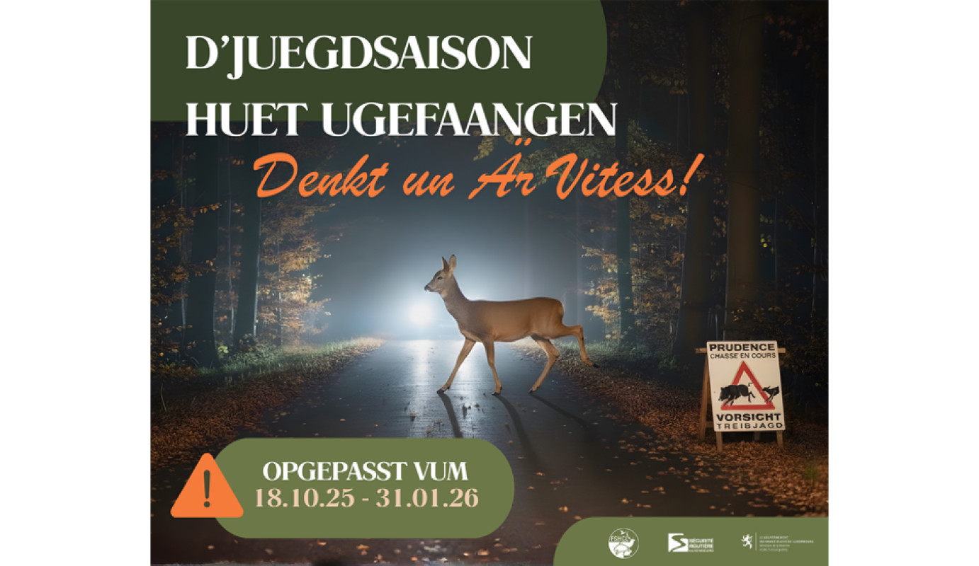 Wéi all Joer fänkt d’Juegdsaison de Samschdeg, 18. Oktober un a geet bis de Samschdeg, 31. Januar 2026. An dëser Period soll ee besonnesch virsiichteg sinn, virun allem no bei Stroossen an a Bëschgebidder, oder wa Schëlder op e Passage vu wëllen Déieren hiweisen. Et gëtt recommandéiert, d’Vitess den Ëmstänn unzepassen.
