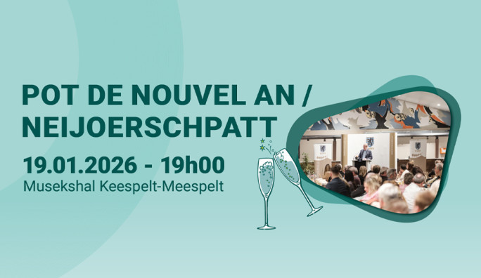 au nom du Collège des bourgmestre et échevins, j’ai l’honneur de vous inviter au Pot de Nouvel An 2026, qui se déroulera à la « Musekshal Keespelt-Meespelt ».