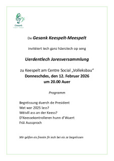 De Gesank Keespelt-Meespelt invitéiert Iech ganz häerzlech op seng Uerdentlech Joresversammlung zu Keespelt am Centre Social „Volleksbau“