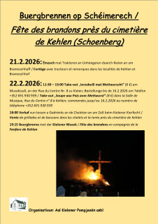 | 22.2.2026 | 11:30 – 13:00 Take-out „Ierzebulli mat Mettwurscht“ (8 €) am Musekssall, an der Rue du Centre Nr. 8 zu Kielen; Bestellunge bis de 16.2.2026 um Telefon +352 691 930 939 / Take-out „Soupe aux Pois avec Mettwurst“ (8 €) dans la Salle de Musique, Rue du Centre n° 8 à Kehlen; commandes jusqu’au 16.2.2026 au numéro de téléphone +352 691 930 939 18:00 Verkaf vun Iessen a Gedrénks an de Chaleten an am Zelt beim Kielener Kierfecht / Vente de grillades et de boissons dans les chalets et la tente près du cimetière de Kehlen 19:15 Buergbrenne mat der Kielener Musek / Fête des brandons en compagnie de la Fanfare de Kehlen |
