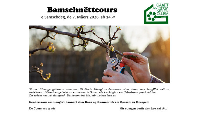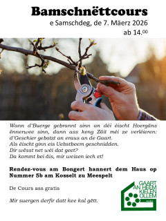 2026-03-06 23:00:00+00:00 14:00 23:59Bamschnëttcours vum Gaart an Heem Kielen - Ollem