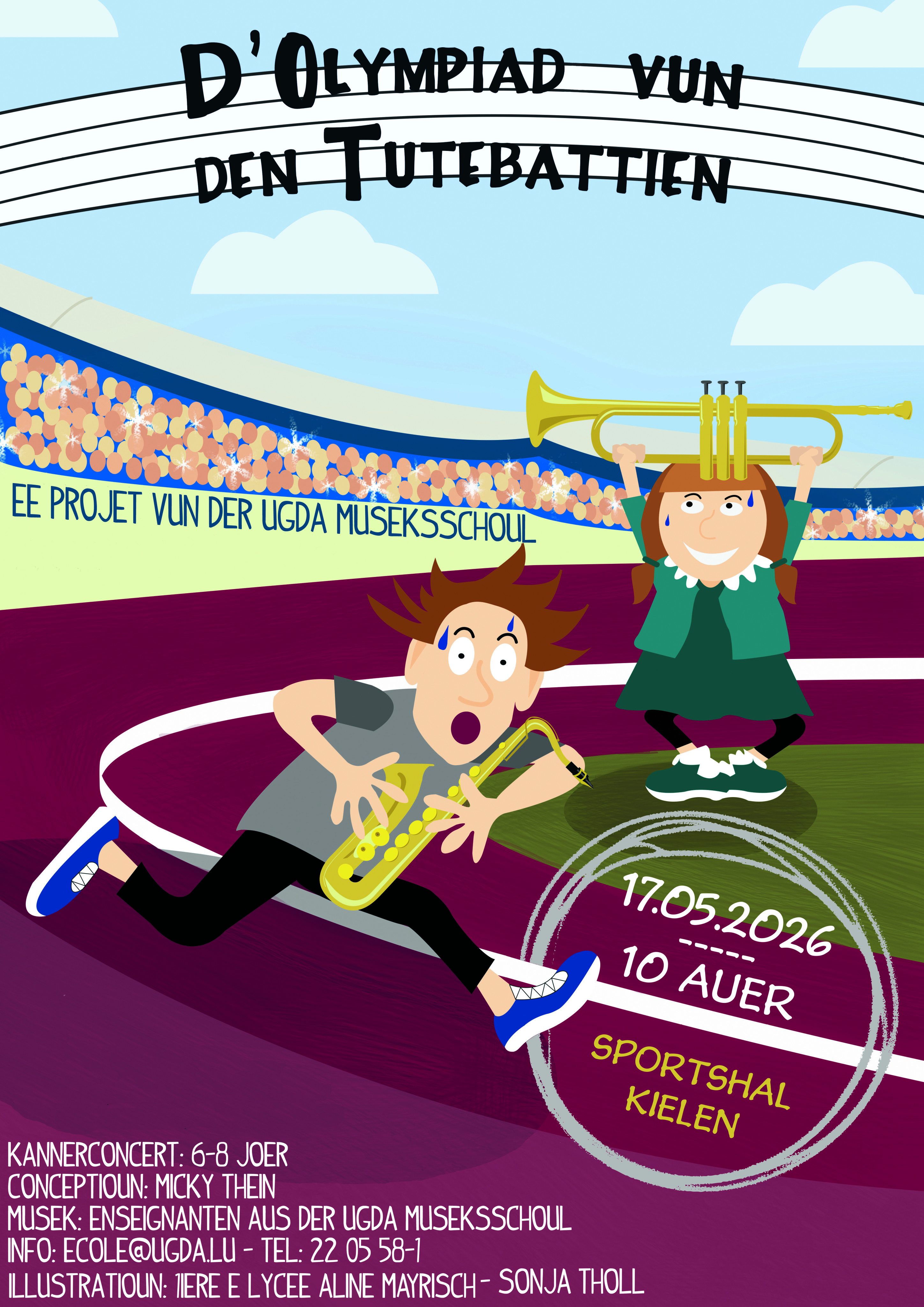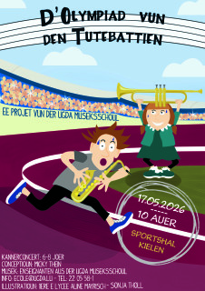 Bei dëser musikalescher Olympiad kréien d’Kanner op eng spilleresch, flott an interaktiv Aart a Weis d’Instrumenter (Querflütt, Klarinett, Saxophone, Trompette, Bugle, Cor, Trombonn, Tuba a Perkussioun) presentéiert a léieren se kennen. Wien ass dee schnellsten oder stäerksten? Wien kann am héchsten oder am wäitste sprangen a wien kann dee luesesten Toun spillen?