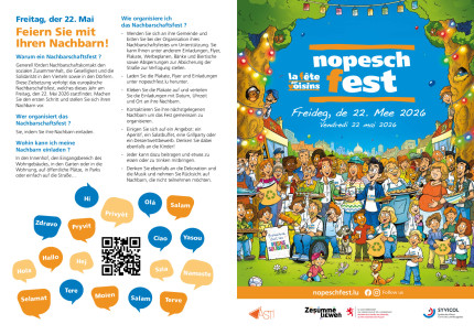 Generell fördert Nachbarschaftskontakt den sozialen Zusammenhalt, die Geselligkeit und die Solidarität in den Vierteln sowie in den Dörfern. Diese Zielsetzung verfolgt das europäische Nachbarschaftsfest, welches dieses Jahr am Freitag, den 22. Mai 2026 stattfindet. Machen Sie den ersten Schritt und stellen Sie sich ihren Nachbarn vor.