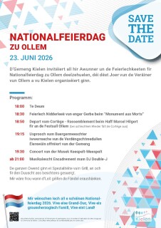 D’Gemeng Kielen invitéiert all hir Awunner un de Feierlechkeeten fir Nationalfeierdag zu Ollem deelzehuelen, déi dëst Joer vun de Veräiner vun Ollem a vu Kielen organiséiert ginn.