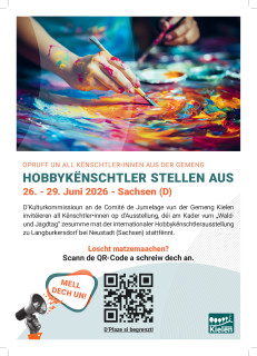 D’Kulturkommissioun an de Comité de Jumelage vun der Gemeng Kielen invitéieren all Kënschtler•innen op d’Ausstellung, déi am Kader vum „Wald und Jagdtag“ zesumme mat der internationaler Hobbykënschtlerausstellung zu Langburkersdorf bei Neustadt (Sachsen) stattfënnt.