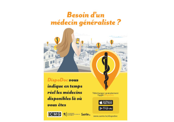 Application gratuite pour téléphone mobile « DispoDoc » développée en collaboration avec l’agence e-Santé et le Cercle des Médecins Généraliste (CMG), permet de localiser en temps réel les médecins généralistes qui sont ouverts dans l’entourage immédiat du patient, y inclus en dehors des horaires d’ouverture usuels.