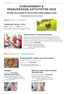 - Des activités sportives telles que gymnastique douce, relaxation, qigong, aqua-gymnastique, natation, vélo, marches de 5 à 7 km, ainsi que de plus courtes balades, avec ou sans bâtons